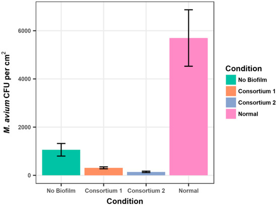 One possible explanation for the reduced number of M. avium cells on Methylobacterium spp. biofilms (Figure 1, Supplementary Materials Table S1) could be that adherent M. avium cells lost their culturability and were unable to form colonies. To rule out that possibility, M. avium counts were measured by qPCR. Following suspension of biofilm-adherent cells, DNA was isolated, and M. avium gene copies enumerated by a sensitive and specific qPCR method [30]. The data, reported as M. avium gene copies/µL of isolated DNA, show that the number of gene copies on Methylobacterium spp. biofilms were below the limit of quantification (i.e., 3.95 × 106 copies/cm2) immediately and after 1 and 3 h (Table 3). These results show that the reduction of M. avium counts on Methylobacterium spp. biofilms reflected by colony counts were not an artifact due to loss of culturability.