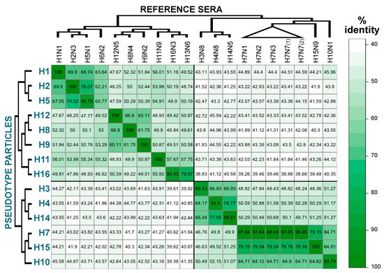 In this study, commonly used reference antisera (for haemagglutination inhibition assay, agar gel immunodiffusion test, and agar gel precipitation test) show high neutralizing responses and cross-reactivity between different strains/subtypes. This could be problematic not only for HI typing, but especially for pp-NT. In fact, in the dilution range analysed, the pp-NT could not discriminate between two distinct pp (e.g., H16 pp was neutralized at the same dilution tested by both H16N3 and H13N6 sera). Preparation of the standard material through dilution of the commonly used reference standard or the use of monoclonal antibody mixtures (with or without the presence of a serum matrix) showing high specificity could be more effective approaches to establish reference materials to be used to validate, standardise, and control pp-NTs. To better understand which factors are underlying the observed cross-reactivity, we have evaluated the percentage amino acid identity between the HAs present on the pp and the HAs used for antisera generation. A percentage-identity heat map was then produced (Figure 2).
