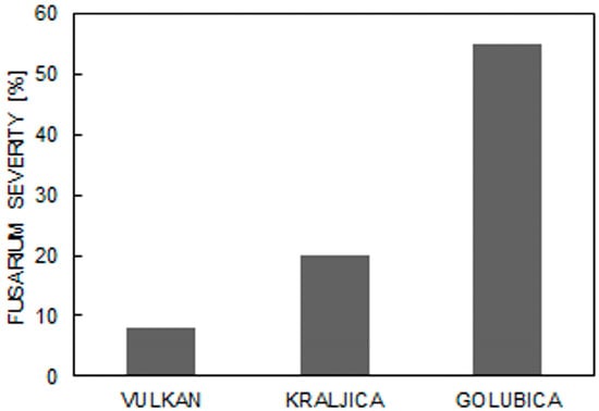 Three wheat varieties were used for FHB resistance testing in 2015/2016 at the experimental field of Agricultural Institute Osijek, Croatia (45°32′ N, 18°44′ E). Those three genotypes originated from the Agricultural Institute Osijek. ‘Vulkan’ is a bread wheat with high yield, moderate quality, and early heading, earlier characterized as FHB-resistant [], while ‘Kraljica’ has good quality and high yield with lodging resistance. ‘Golubica’ is a high quality variety with moderate yield, previously characterized as Fusarium-susceptible []. The soil type was eutric cambisol. The average annual precipitation in the growing season was 595 mm and the average annual temperature was 9.73 °C. Varieties were sown in eight row plots with a 7 m length and a 1.08 m width in October at a sowing rate of 330 seeds m−2, where treatments (Fusarium and control treatments) were replicated in two plots. Spray inoculations with Fusarium spp. were performed individually for each genotype at flowering (Zadok’s scale 65) [] using a tractor-back sprayer. To maintain moisture, ears were water sprayed with tractor back-sprayer on several occasions during the day. General resistance (percentage of diseased spikelets in the plot) was estimated according to a linear scale (0–100%) 26 days after inoculation.