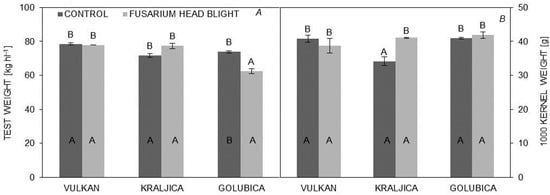 The ‘Golubica’ variety, compared to other varieties, was significantly decreased in test weight under FHB treatment (62.45 kg hl−1) compared to the control treatment. For ‘Vulkan’ and ‘Kraljica’, test weight was not statistically significant between treatments, but infected ears of ‘Kraljica’ (34.10 g) with control treatment, compared to the other two varieties, showed a significant decrease in 1000 kernel weight. Comparing the 1000 kernel weight of all varieties of FHB-infected plants with control treatment, no significant difference was found (Figure 2A,B).