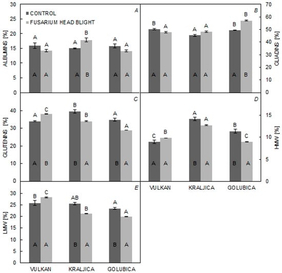 The percentage of AG was significantly increased in ‘Kraljica’ with FHB treatment compared to the control treatment. The percentage of GLI was significantly increased in ‘Golubica’ in the FHB treatment group in comparison to the control group. In the control group, ‘Kraljica’ had a significantly lower percentage of GLI compared to other varieties; in contrast, both ‘Vulkan’ and ‘Kraljica’, in comparison to ‘Golubica’, had a significantly lower percentage of GLI under FHB treatment (Figure 2A,B). In the control group, ‘Kraljica’, in comparison to ‘Vulkan’ and ‘Golubica’, had a significantly higher percentage of GLU and HMW. In the FHB treatment group, compared to the control group, ‘Vulkan’ was significantly increased in the percentage of GLU; ‘Kraljica’ and ‘Golubica’ saw a significant decrease in this parameter (Figure 3C,D). The percentage of HMW was significantly lower in ‘Vulkan’, in comparison to ‘Kraljica’ and ‘Golubica’, in the control group. In ‘Kraljica’ and ‘Golubica’, the percentage of HMW and LMW was significantly lower in inoculated plants in the FHB treatment group. ‘Vulkan’, compared with the other two varieties, showed the highest percentage of LMW in the FHB treatment group (Figure 3E).