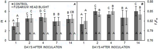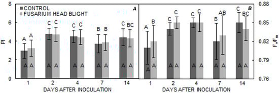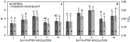 (A,B). Means ± SE for parameters PI and Fv/Fm from FHB and control treatments for ‘Golubica’ obtained at different measuring times. Letters under the graphs indicate significantly different values (p < 0.05) among different measuring times under the same treatment. Letters within the graphs indicate significantly different values between different treatments at one measuring point.