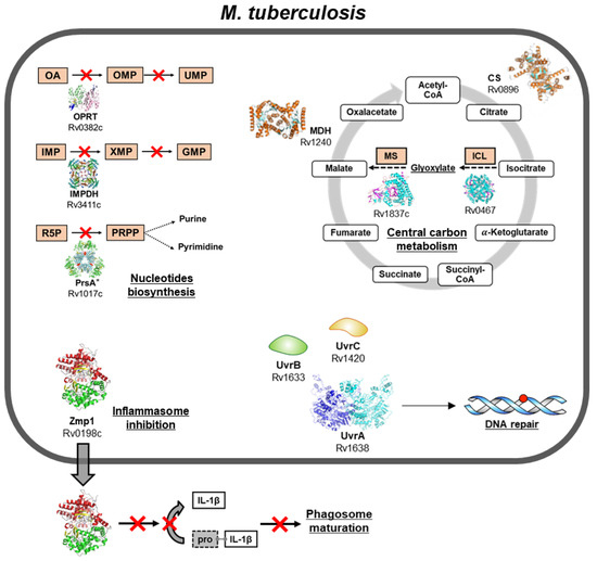 Visual summary, gene names, and structures of the molecular determinants of Mycobacterium tuberculosis infection described in the present review. From the upper left to upper right, in a counterclockwise fashion: enzymes involved in the biosynthesis of nucleotides, in inflammasome inhibition, DNA repair, and in the tricarboxylic acid (TCA) cycle, including the glyoxylate shunt. Abbreviations: OA, orotic acid; OPRT, orotate phosphoribosyltransferase; OMP, orotidine 5′-monophosphate; UMP, uridine monophosphate; IMP, inosine monophosphate; IMPDH, inosine 5′-monophosphate dehydrogenase; XMP, xanthosine monophosphate; GMP; guanosine monophosphate; R5P, Ribose 5-phopshate; PRPP, phosphorybosyl pyrophosphate; CS: citrate synthase; MDH: malate dehydrogenase; MS: malate synthase; ICL: isocitrate lyase. * Structure shown is of the Mycobacterium smegmatis PrsA homolog [8].