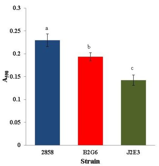 Impact of hly and prfA on biofilm formation. Biofilms were established at 37 °C in wells of 96-well polystyrene plates over 48 h (8 wells/strain) and measured following staining with crystal violet as described in Materials and Methods. Strains from this study are shown on the x axis, wild type 2011L-2858 (2858), hly inactivated mutant B2G6, and prfA inactivated mutant J2E3. The y axis indicates absorbance of ethanol used to destain crystal violet stained wells at 590 nm, thus serving as an indication of biofilm formation. Different letters indicate statistically significant differences (p < 0.05). Data are from three independent trials.