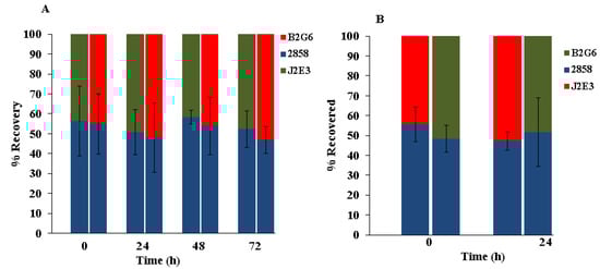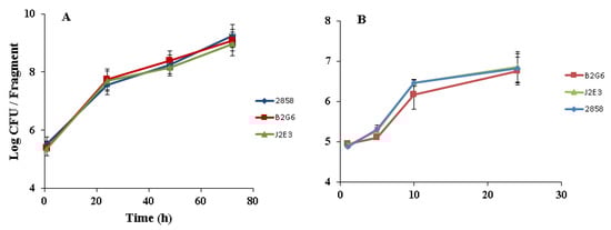 The apparent requirement of intact prfA and hly for biofilm formation suggested the possibility that colonization of produce might also be impaired in the mutants. Since expression of hly and prfA is under temperature control and is optimal at 37 °C [,], we investigated produce colonization both at 25 °C, a temperature relevant for produce contamination, and at 37 °C. The parental strain and the two mutants showed similar adherence on cantaloupe rind at both 25 and 37 °C. For all three strains, adherent cells represented 35 ± 10% of the population inoculated on the rind. Furthermore, no significant differences in growth on the cantaloupe rind were noted between the parental strain 2858 and either B2G6 or J2E3 at 25 °C (monitored up to 72 h) (Figure 4A). Growth was also not impaired at 37 °C (Figure 4B), a temperature at which, as indicated above, prfA and hly would be expected to be optimally expressed [,].