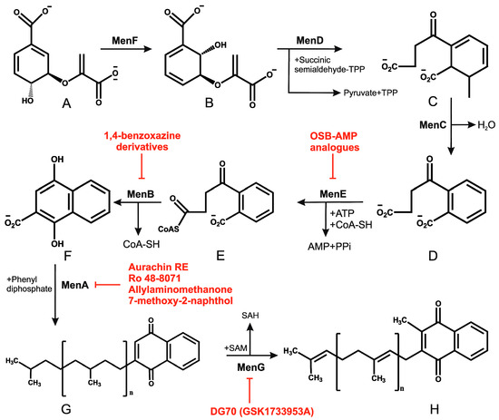 Mycobacterial menaquinone biosynthesis pathway and its inhibitors. (A–H) represent chorismate, isochorismate, 2-succinyl-6-hydroxy-2,4-cyclohexadiene-1-carboxylate, o-succinylbenzoate, o-succinylbenzoyl-CoA, 1,4-dihydroxy-2-naphthoyl CoA, demethylmenaquinone, and menaquinone respectively. Drugs that target the menaquinone biosynthesis enzymes are shown by red flathead arrows.