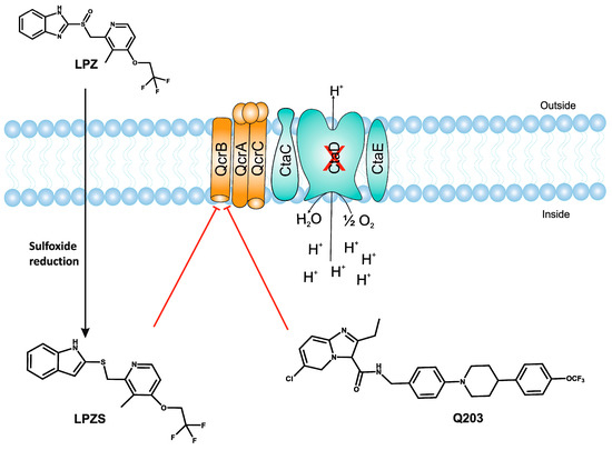 Interestingly, in an effort to build a strong pipeline for antimycobacterial drugs, a pool of 1280 FDA approved drugs was screened for growth inhibition of Mtb residing in MRC-5 lung fibroblasts. This screen resulted revealed that the gastric proton pump inhibitor lansoprazole (LPZ, Prevacid) exerted potent activity against Mtb. Importantly, other proton pump inhibitors, such as omeprazole and pantoprazole, were not able to inhibit Mtb growth. It was further demonstrated that LPZ is rapidly converted to the potent antimycobacterial agent, lansoprazole sulfide (LPZS). Thus, LPZ acts as a prodrug that is converted into LPZS within the host cell. As the conversion of LPZ into LPZS is inefficient, a 22-fold higher drug dose was required to kill Mtb cells in broth cultures. LPZS selectively kills Mtb; it is not toxic to closely related NTMs or Gram-positive and-negative bacteria []. Target identification studies revealed that LPZS targets the cytochrome bc1 complex (as depicted in Figure 2) of the respiratory chain, and conversion of leucine-176 to proline in qcrB confers drug resistance. Furthermore, superimposition of the mutant mycobacterial protein structure onto the published QcrB protein from R. sphaeroides [] revealed that both L176P (a mutation leading to LPZS resistance) and T313A (which confers IPA resistance) were localized to the same site, i.e., the P site, at which ubiquinol oxidation occurs. However, L176P mutants remained susceptible to various IPA, whereas T313A mutants were susceptible to LPZS, revealing different binding mechanisms for each compound []. There are conflicting reports on the oral bioavailability of this drug. For example, oral administration of the drug is reported to significantly reduce mycobacterial burden [], whereas others have shown that intraperitoneal injection of LPZS molecules, rather than the LPZ prodrug, is required to acquire plasma and lung tissue concentrations of the active molecule sufficient to kill Mtb []. Recently, the use of LPZ has been associated with reduced incidence of TB when compared with the use of omeprazole or pantoprazole [].