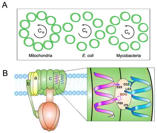 Schematic view of ATP synthase and its interaction with bedaquiline (BDQ). (A) Depicts the top view of C-ring of ATP synthase Fo complex and comparison of C-rings of mitochondria (C10), E. coli (C8) and mycobacteria (C9). (B) BDQ binds between the two c subunits of the C-ring. The interaction of BDQ with C ring is illustrated in the zoomed region. BDQ specifically interacts with Glu65 (E65), Phe69 (F69), Leu63 (L63), Asp32 (D32), and Ile70 (I70) of adjacent c subunits.