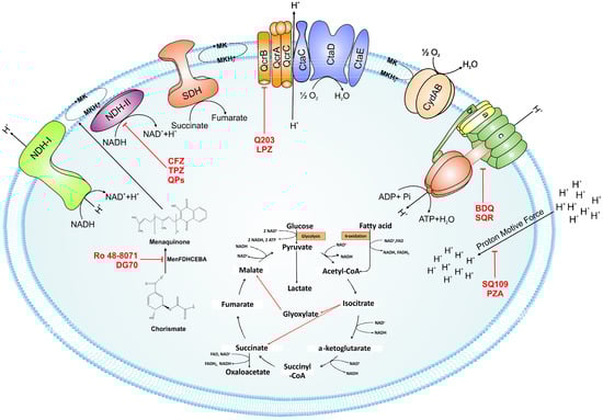 Schematic representation of the mycobacterial electron transport chain and its inhibitors. NADH derived via glycolysis and tricarboxylic acid (TCA) cycle feds electrons into the electron transport chain by NADH dehydrogenase. The menaquinone (MK) pool can be reduced by primary dehydrogenases such as NADH dehydrogenases (NDH1 and NDH2) and via succinate dehydrogenase (SDH). Electrons from the menaquinone pool are accepted directly by cytochrome bd-type terminal oxidase or via bc1-aa3 supercomplex. A proton motive force (PMF) is generated during electron transport chain because of pumping of protons across the membrane. This PMF is used by the ATP synthase to generate ATP. Drugs that target the oxidative phosphorylation are shown by red flathead arrows. Abbreviations: CFZ, clofazimine; TPZ, trifluoperazine; QPs, quinolinyl pyrimidines; Q203, imidazopyridine amide; LPZ, lansoprazole; Ro 48-8071, (4-bromophenyl)[2-fluoro-4-[[6-(methyl-2-propenylamino)hexyl]oxy]phenyl]-methanone; DG70,biphenyl amide; BDQ, bedaquiline; SQR, squaramide; SQ109, N-adamantan-2-yl-N-((E)-3,7-dimethyl-octa-2,6-dienyl)-ethane-1,2-diamine; PYZ, pyrazinamide. Red arrows in the TCA cycle depict the glyoxylate shunt.