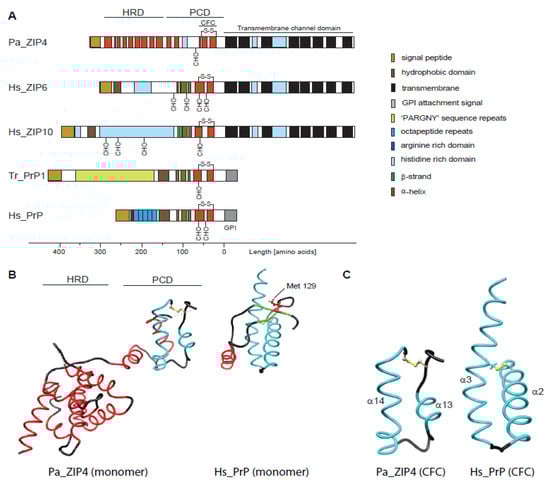 Prion proteins are notorious for their central role in fatal neurodegenerative diseases in a subset of mammalian species, including humans [,,]. In prion diseases, the cellular prion protein (PrPC) undergoes structural rearrangements to a β-sheet-rich conformer termed PrPSc (named after Scrapie in sheep, the first known prion disease). That essential role of PrP in these disorders was demonstrated by showing that the knockout of the prion protein gene (Prnp) renders mice refractory to acquiring the disease []. A side-product of mouse Prnp knockout studies undertaken concomitantly in several laboratories was the identification of a paralog of the prion gene, termed Doppel (Dpl). Dpl maps to a genomic region C-terminal to Prnp and, consequently, was determined to have arisen from a gene duplication event [,]. Further genomic sequence analyses revealed that the Shadoo (Sho) gene coded for an additional prion protein paralog [,]. The ancestry of this small gene family was enigmatic until 2009 when PrP was initially observed to interact with a subset of zinc transporters of the Zrt-/Irt-like Protein (ZIP) family [], and subsequent bioinformatic analyses revealed PrP and ZIP transporters to meet several criteria that establish common ancestry []. The evolutionary relationship was particularly apparent in comparisons of PrP and ZIP ectodomain sequences in fish genomes, which exhibit a degree of sequence similarity and identity previously reported in pair-wise sequence comparisons of PrP and Dpl, or PrP and Sho. In contrast to ZIPs, which are multi-spanning transmembrane proteins, the prion protein is anchored in the membrane by a glycosylphosphatidylinositol (GPI) anchor, a shift in topology also observed in other protein families [,]. Consistent with the view that the prion protein founder gene represented a truncated ZIP gene, such a shift in topology can be experimentally induced when a gene coding for a transmembrane protein is truncated at the 3′ end of its first transmembrane domain [].