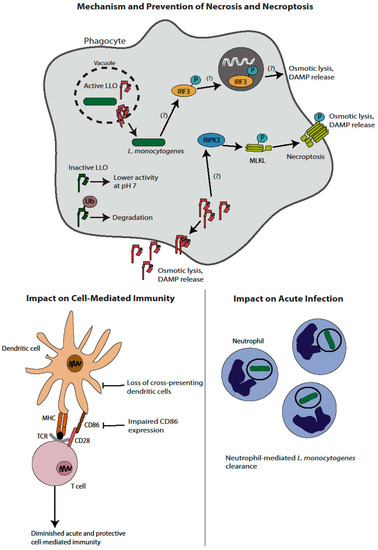 Induction of necrosis by L. monocytogenes and implications on immunity and virulence. LLO can induce traditional necrosis; as such, L. monocytogenes has evolved mechanisms to avoid lytic activity of LLO outside the vacuole, including an acidic pH optimum and ubiquitin-mediated degradation. Strains of L. monocytogenes-induced to express active LLO in the cytosol lead to membrane pore formation and osmotic lysis. In addition, L. monocytogenes induces programmed necrosis. Multiple proposed pathways exist, including a RIPK3-mediated pathway leading to pore formation by MLKL and an IRF3 dependent pathway that occurs by a yet undefined mechanism. Induction of necrosis ultimately leads to a host-protective neutrophil-mediated clearance of L. monocytogenes and an impaired cell-mediated immune response. Impaired immunity is at least in part mediated by diminished numbers of cross-presenting dendritic cells, as well as lower CD86 expression.