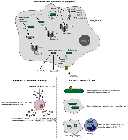 Taken together (Figure 2), similar to necrosis, albeit by different mechanisms, it is clear that inflammasome-mediated pyroptosis negatively impacts both virulence and priming of cell-mediated immunity in the context of L. monocytogenes infection. As such, L. monocytogenes, like other professional intracellular pathogens [81], has evolved mechanisms to avoid detection by this potent, host-protective, innate immune defense.
