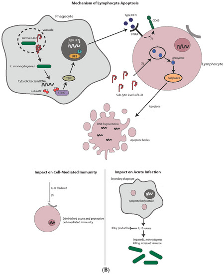 In addition to a direct role for extracellular LLO, type I interferons (IFN) have been implicated in lymphocyte apoptosis during L. monocytogenes infections. L. monocytogenes infection results in robust production of type I interferon due to activation of STING by both c-di-AMP and less frequently cytosolic bacterial DNA [98,99,100]. Type I IFN subsequently has been shown to antigen-independently preactivate T cells, potentially increasing T cell sensitivity to apoptosis [101]. Following systemic infection with L. monocytogenes, type I IFN receptor (IFNAR)-deficient mice demonstrate both decreased lymphocyte apoptosis and increased resistance to infection, consistent with a model whereby lymphocyte apoptosis is a pathogen-driven process to promote virulence [33,34,101]. Independent of the mechanism of apoptosis induction, it is thought that the increased virulence of L. monocytogenes associated with lymphocyte apoptosis is mediated by the activation of an immunosuppressive state. Uptake of apoptotic bodies results in production of anti-inflammatory cytokine production, notably IL-10, by phagocytes [102]. IL-10 antagonizes production of proinflammatory IFN-γ, which is required for optimal acute defense against L. monocytogenes. Consistent with this model, IL-10-deficient mice showed increased resistance to L. monocytogenes infection despite having equivalent levels of apoptotic splenic cells, suggesting the susceptibility associated with lymphocyte apoptosis could be mediated by IL-10 [94,103]. Finally, mice lacking lymphocytes altogether are acutely resistant to L. monocytogenes, further suggesting that increased lymphocyte apoptosis results in decreased resistance to infection [103,104,105].