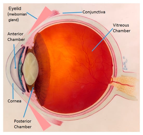 Excess amounts of tears drain into the nasal sinus through nasolacrimal ducts whose openings (puncta) in the eyelids are adjacent to the nose (not indicated in Figure 1). The nasolacrimal ducts also drain topically applied drugs into the sinuses. Dacryocystitis forms when the nasolacrimal duct is blocked and infection develops due to the overgrowth of organisms in the local flora, most often S. aureus, S. epidermidis, or pneumococcus []. Such an infection often involves the lacrimal gland and can spread to the cornea potentially resulting in corneal ulceration. Patients with dry eye issues often have the duct closed using punctal plugs to limit the drainage of tears down the duct. Dry eye is a compromising condition leading to anterior eye infections so the plugs are useful for retaining tears; however, the plugs can serve as a foundation for the development of a bacterial biofilm [].