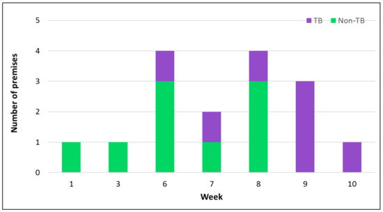 Similar to previous findings, a correlation between age, time since last vaccination and number of vaccine doses received was also established [4,16]. Maternal antibodies in foals born to seropositive mares generally persist for up to six months; however, in some cases, these may be more durable [32,33,34]. In a comparative antibody study, which examined the antibody levels in different equine populations in Ireland, TB weanlings (age 6–10 months) were identified as the most susceptible [35]. In this study, virus infection among TB weanlings in Ireland was identified for the first time (Premises 9, 10, 14). Vaccination of weanlings is currently not a requirement for attendance at TB sales irrespective of immunological status. Weanlings on two of the three premises had recently arrived from large TB sales in Ireland (Premises 9) and the U.K. (Premises 10). The index case on both premises was unvaccinated and seronegative on initial sampling.