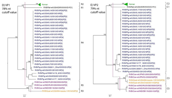 - Matthijnssens, J.; Otto, P.H.; Ciarlet, M.; Desselberger, U.; Van Ranst, M.; Johne, R. VP6-sequence-based cutoff values as a criterion for rotavirus species demarcation. Arch. Virol. 2012, 157, 1177–1182. [Google Scholar] [CrossRef] [PubMed]