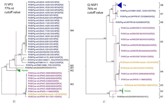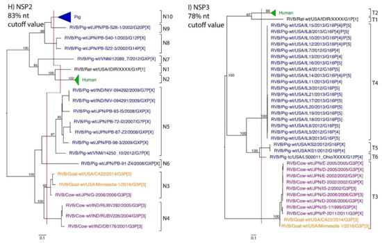 RVA strains have been well characterized, and, currently, the Rotavirus Classification Working Group (RCWG) maintains an RVA classification system calculating percent identity cutoff values to categorize the genotypes for the eleven segments of RVA [29]. Genotype constellations are denoted as Gx-P[x]-Ix-Rx-Cx-Mx-Ax-Nx-Tx-Ex-Hx representing the VP7-VP4-VP6-VP1-VP2-VP3-NSP1-NSP2-NSP3-NSP4-NSP5/6 encoding genes, respectively. The RVB percent identity cutoff values of 80%, 81%, 70%, 76%, 75%, 78%, 70% and 78% have been established for segments VP7, VP6, VP3, NSP1, NSP2, NSP3, NSP4, and NSP5, respectively [28,30,31,32,33,34]. Based on these cutoff values, 24 G [35], 13 I [31], 4 M [30], 7 A [34], 4 N [32], 4 T [30], 4 E [30], and 6 H [33] genotypes have been identified. In the present study, RVB nucleotide sequences of several porcine strains and a single caprine strain were determined to investigate the genetic diversity and illustrate the phylogenetic relationships of all 11 RVB gene segments to identify distinct genotypes and reassortment events.