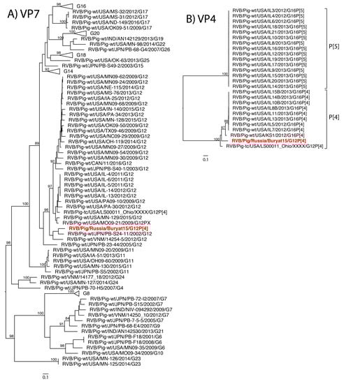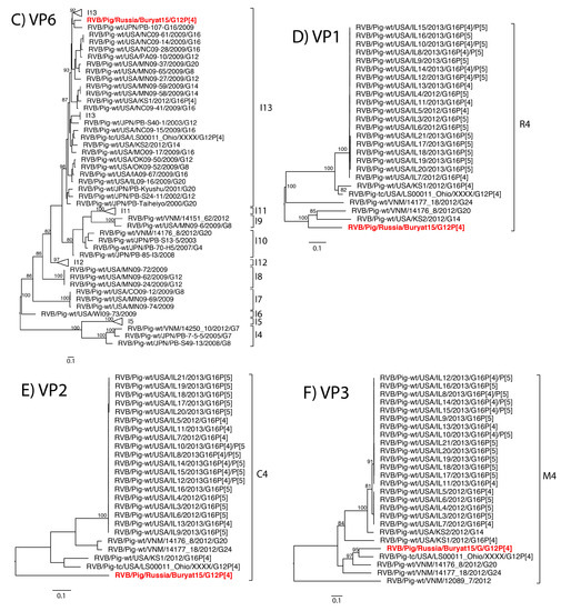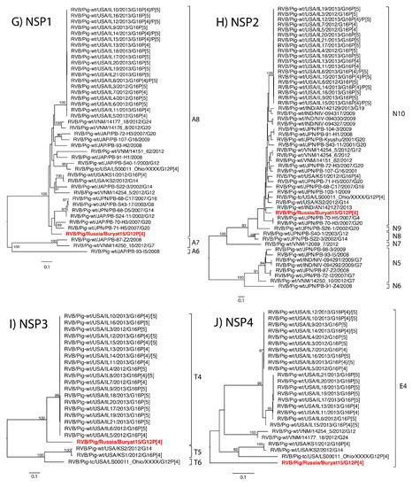 Phylogenetic trees for the 11 gene segments of swine RVB (A–K) with bootstrap values represented at the nodes (500 replicates). Bootstrap values below 80% are not shown. Selected genotype clades were clasped and represented by triangles. Russian strain Buryat15 is represented in bolded red. Scale bars represent 10 nucleotide changes per nucleotide site. Genotypes are labeled with brackets for all strains except VP7, where G genotypes are listed in the strain name.