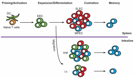 Innate inflammatory responses are critical for host defense against Lm infection. A hierarchical recruitment and activation of innate immune cells such as dendritic cells (DC) and inflammatory monocytes to the foci of infection coupled with interleukin (IL)-12, IL-18, interferon (IFN)-γ and tumor necrosis factor (TNF)-α production are essential for the early control of Lm infection [11]. However, sterilizing immunity to Lm infection requires T cells [12,13,14]. CD8 T cells, along with CD4 T cells and γδ T cells collaborate to provide optimal protection against Lm infection [9,13,14,15]. Extensive research has been carried out in the past three decades to broaden our understanding of T cell responses to Lm infection. Lm is also a model pathogen to study T cell biology in general because of its ability to induce robust T cell responses that are readily tractable during all phases of the adaptive response [16,17]. This review will focus on the CD8 T cell response to Lm infection, which can be characterized by four phases: (1) priming and activation; (2) clonal expansion and differentiation; (3) contraction; and (4) memory formation (Figure 1). Details of each phase of the CD8 T cell response to Lm infection will be discussed. Specifically, the role of dendritic cell subsets in acquiring and presenting Lm antigens to CD8 T cells and events that occur during CD8 T cell priming and activation will be addressed. Signals that regulate CD8 T cell expansion, differentiation and contraction during Lm infection will be explored. The formation of memory CD8 T cell subsets in the circulation and in the intestine will be analyzed. Additionally, the comparison of the CD8 T cell response after i.v. versus oral Lm infection will be included. Finally, CD8 T cell-mediated protective immunity against Lm infection and the use of Lm as a vaccine vector for cancer immunotherapy will be highlighted.