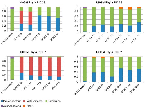 Gn piglets transplanted with human gut microbiota (HGM) showed a switch from Lactobacillus spp. (Firmicutes) to Proteobacteria upon challenge with human rotavirus; this change was prevented by pretreatment of piglets with Lactobacillus rhamnosus []. In a more recent study, neonatal Gn piglets were transplanted with a mixture of Proteobacteria and Bacteriodetes (obtained from a child with good immune response to vaccination; ‘Healthy human gut microbiota’, HHGM) or Proteobacteria and Firmicutes spp. (obtained from a child with insufficient immune response to vaccination; ‘Unhealthy human gut microbiota’, UHGM) and challenged with a virulent human rotavirus. It was observed that the rotavirus-associated acute gastroenteritis (AGE) in animals inoculated with HHGM was less severe and rotavirus shedding lower than in animals inoculated with UHGM []. Gn piglets transplanted with HHGM expanded Bacteriodetes spp. after rotavirus infection, whereas animals transplanted with UHGM maintained the prevalence of Firmicutes spp. after challenge []. (Figure 2).