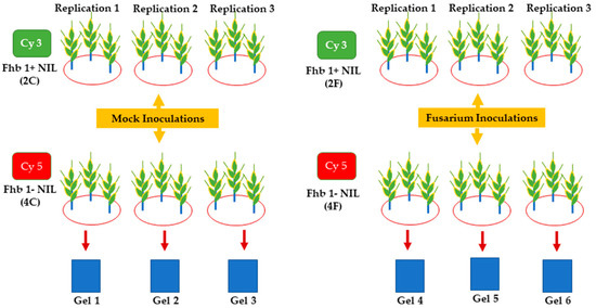 The 2D-DIGE assays were performed by Applied Biomics (Hayward, CA, USA) following the procedures reported in the previous proteomic evaluations by our group and in other successful stress proteomic studies [104,105,106,107,108]. Briefly, 30 µg of a minimal fluorescent-labeled protein mixture was used for the analytical gels in each 2D-DIGE experiment. Each mixture consisted of an equal amount of Cy3-labeled fhb1+ NIL protein sample and Cy5-labeled fhb1- NIL protein sample. Two-times-concentrated 2D sample buffer (Bio-Rad, Hercules, CA, USA) was added to each mixture, followed by 100 μL of DeStreak solution and rehydration buffer (Bio-Rad, Hercules, CA, USA), to obtain a final volume of 350 μL for the gradient (pH 4.0–7.0) IPG strips. The protein samples were loaded onto the IPG strips and isoelectric focusing (IEF) was performed as described previously [104,105,106,107,108,109]. Upon the completion of IEF, the IPG strips were incubated in freshly-made equilibration buffer-I for 15 min, after which they were incubated in equilibration buffer-II (Bio-Rad, Hercules, CA, USA) for another 15 min with gentle shaking. The IPG strips were rinsed in Tris-glycine-SDS running buffer (Bio-Rad, Hercules, CA, USA) and then transferred onto a 12% SDS polyacrylamide gel. The gel was then sealed with 0.5% agarose solution for the second-dimension electrophoresis. The SDS gels were electrophoresed at 150 V at 15 °C until completion. During the 2D-DIGE, the two samples (mock and fungal inoculation) from each NIL were mixed and run on one gel. Three replicate runs per combination were conducted during the study. Therefore, a total of six gels were run for the NIL pair to achieve the statistical significance needed to confirm protein spots (Figure 1).
