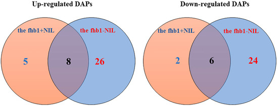 The in-gel comparisons revealed DAPs for each NIL (Figure 2) at 24 h after inoculation (hai). We studied the 80 top-ranking DAPs and found that 50 were specific to the fhb1- NIL, seven were specific to the fhb1+ NIL, 14 were shared by both NILs, and the rest were not significant in either NIL (Table S2). Figure 3 shows the distribution of the significant DAPs in VENN diagram.