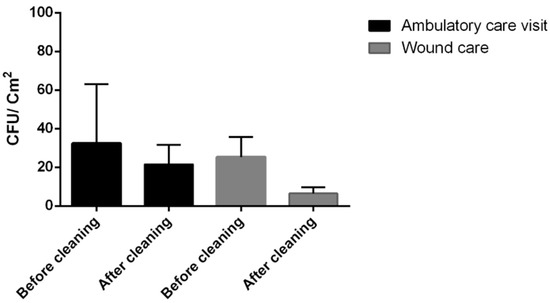 Mean and standard deviation of CFU values found before and after cleaning, on surfaces, in each ambulatory setting.