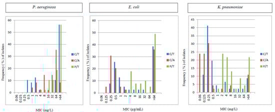 MIC of Ceftolozane/Tazobactam (C/T), Ceftazidime/Avibactam (C/A), and Piperacillin /Tazobactam (P/T) against E. coli, K. pneumoniae and P. aeruginosa.