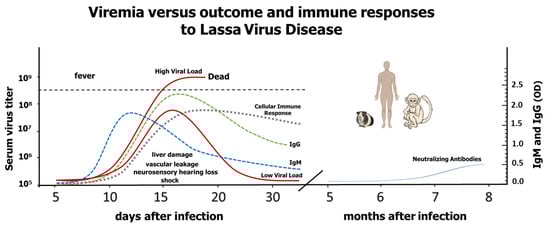 LASV pathogenesis and its failure to develop strong immune responses remain a mystery. Although there is a strong correlation between the level of viremia and the disease outcome (Figure 1), the damage is not caused directly by viral-cell lysis and seems to depend on the initial host immune response [20,21,22]. The first symptoms are poorly differentiated from other diseases. In addition, the incubation period can be as long as two weeks. Those two situations make the initial diagnosis difficult and cause a delay in the initiation of the treatment. Twenty percent of the infected patients develop symptoms of muscle fatigue, facial edema, and sore throat, and a few of these progress to systemic disease with mucosal, conjunctival, gastrointestinal or genital bleeding. Platelet dysfunction and endothelial damage seem to play a role in the characteristic vascular leakage.