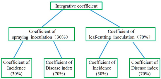 The hierarchy frame and weighting (%) of the integrative coefficient. Coefficients at each level: Spraying/leaf-cutting inoculation coefficient = 0.3 × incidence coefficient + 0.7 × disease index coefficient. Integrated coefficient = 0.3 × coefficient of spraying inoculation + 0.7 × coefficient of leaf-cutting inoculation.
