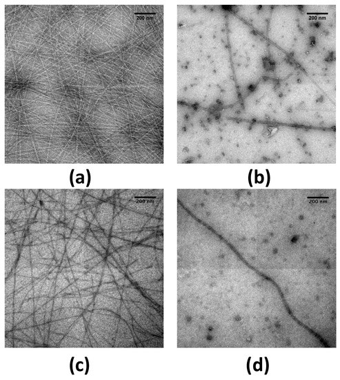 To investigate the possibility that Hfq functional amyloids can be remodeled in vitro, we screened the effect of EGCG on Hfq-CTR fibrils using transmission electron microscopy (TEM, see Section 4.3). In order to allow a statistical analysis on the sample, we used a negative staining procedure and not cryoTEM to reduce the length of acquisition. Note that thioflavin T staining is a widely used method to follow amyloids self-assembly. Nevertheless in the case of Hfq-CTR, thioflavin inhibits fibril formation and cannot be used [41]. As a model we first used the 11 amino acid residues peptide corresponding to the Hfq amyloid region only, referred to as Hfq CTR11 [42] (see sequence in Materials and Methods, Section 4.2). The effect of the EGCG’s potential amyloid interference was tested on preformed CTR11 fibrils (50 mg/mL). Fibrils were incubated in EGCG solutions (from 1 to 5 mM) for 24 h and examined by TEM (Figure 1). In the absence of the compound, the fibrils were abundant (Figure 1a), while incubation with 1 mM EGCG significantly reduced the amount of fibrils and led to formation of diffuse aggregates close to the fibrils (Figure 1b). At higher concentrations only rare fibrils can be observed (Figure 1c,d). This effect was confirmed with the 38 amino acid residues peptide corresponding to the full Hfq-CTR region (Figure 2). The corresponding peptide is referred to as Hfq CTR38 [34] (sequence in Materials and Methods, Section 4.2). TEM analyses did not allow for observing the total disappearance of CTR38 pre-formed fibrils when EGCG was added, in contrast to Hfq CTR11. Nevertheless, we clearly see lower amount of fibrils, which confirms that EGCG also disrupts CTR38 fibrils, even if less efficiently than in the case of CTR11 (Figure 2a,b) Note that spontaneous self-assembly of CTR38 is significantly lower than for CTR11 (weeks vs days) and that CTR38 peptide has been incubated for a few weeks to assure self-assembly before adding EGCG for 24 h [34,43].