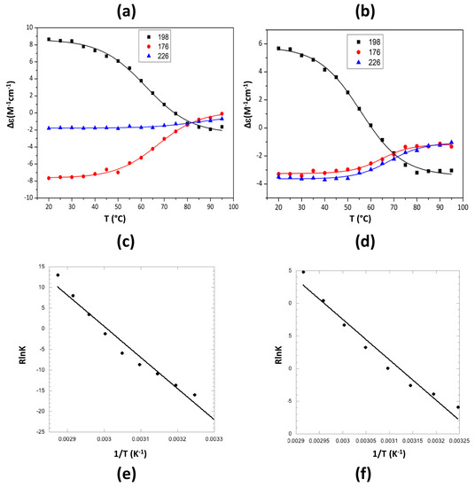 Melting curves of CTR11 fibrils, alone or in the presence of epigallocatechin-3-gallate (EGCG). (a,c,e) CTR11 alone; (b,d,f) CTR11 in the presence of EGCG 5 mM (substracted from EGCG signal). (a,b) Synchrotron radiation circular dichroism (SRCD) spectra measurements were carried out every 5 °C; blue 20 °C; red 95 °C (c,d): Measurement of the melting temperature at 176, 198 and 226 nm. The inversion of the band at 198 nm from a positive to a negative value is the signature of the conversion from relaxed antiparallel β-sheets (β anti 2) into right-handed twisted antiparallel β-sheets (β anti 3) [47] (Table 2). The melting temperatures measured from SRCD values at 198 nm are Tm = 62.0 ± 1 °C for CTR11 alone (c) and Tm = 55.6 ± 1 °C in the presence of EGCG (d). (e,f) Van’t Hoff’s plots giving access to ∆H° and ∆S° of CTR11 melting. The isosbestic point indicates a two state model and a Boltzmann sigmoid equation has been used for melting curves fitting.
