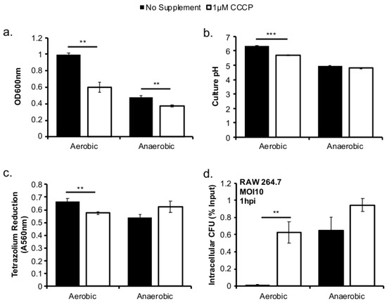 If respiratory activity prior to infection is key in subsequent intracellular success, compromising respiratory activity in aerobically grown L. monocytogenes should, in theory, result in reduced pathogenesis. To test this hypothesis, L. monocytogenes was grown in BHI at 37 °C in the presence of the proton ionophore, CCCP, to reduce its respiratory activity and its subsequent infections were assessed. A working concentration of 1 µM CCCP was established to reduce aerobic growth to a level similar to that of anaerobic growth without complete growth inhibition. Compared to no supplement, both aerobic and anaerobic growth with 1 µM CCCP was significantly reduced (Figure 3a), however there was a greater growth inhibition in the aerobically grown L. monocytogenes compared to that in anaerobically grown L. monocytogenes. Compared to no supplementation, CCCP treatment resulted in significantly reduced culture pH and tetrazolium reduction activity under aerobic, but not anaerobic, conditions (Figure 3b,c). L. monocytogenes grown with or without CCCP treatment was then used to infect RAW264.7 macrophages to assess the impact of prior CCCP treatment on subsequent intracellular growth. At one hour post infection (hpi), while prior CCCP treatment did not affect subsequent infections by anaerobically grown L. monocytogenes, there was a significantly higher intracellular CFU in macrophages infected with the aerobically grown, CCCP-treated L. monocytogenes than those infected with aerobically grown, untreated controls. However, there was no difference in intracellular growth over an eight-hour period for bacteria grown with or without CCCP (data not shown).