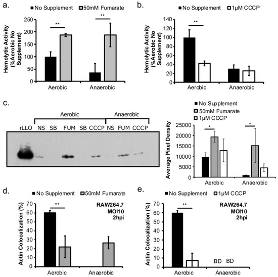 Modulations of respiratory activity alter production of LLO and actin co-localization. L. monocytogenes was grown overnight at 37 °C in BHI. Culture supernatant was used to quantify LLO activity using a hemolytic assay (a,b). Averages of triplicates were plotted with error bars representing standard deviation. Data represent three independent experiments. LLO abundance in culture supernatant was determined using immunoblotting (c, left) followed by pixel density analysis (c, right). Blot shown is representative of six independent experiments. (rLLO, recombinant LLO control; NS, no supplement; SB, sample buffer; FUM, fumarate-treated L. monocytogenes; CCCP, CCCP-treated L. monocytogenes.) Averages of pixel density from six blots were plotted with error bars representing standard error of the mean (n = 6). RAW264.7 macrophages were infected with overnight L. monocytogenes for 30 min at a MOI of 10. Actin colocalization was determined at 2 h post infection (hpi). BD, or below detection, indicates a lack of colocalization. Significant differences (*, p < 0.05; **, 0.001 < p < 0.01) were calculated using the two-tailed Student’s t-test.