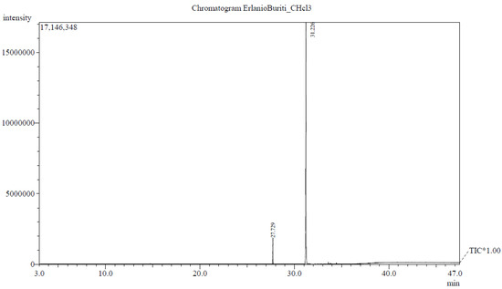 GC/MS spectral analysis allowed for the identification of the M. flexuosa fixed oil composition percentage of fatty acids (Table 3 and Figure 1). The fixed oil was characterized by a higher content of unsaturated fatty acids (89.81%) than saturated fatty acids (10.19%). In the oil, oleic acid (89.81%), a monounsaturated fatty acid, was identified as the main fatty acid.