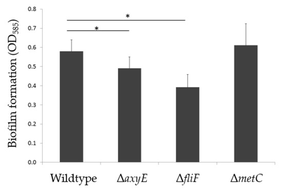 The investigation of the relevance of motility, cellular discharge and methionine biosynthesis for biofilm formation and antimicrobial susceptibility took place by the construction of knockout mutants (ΔfliF, ΔaxyE and ΔmetC, respectively), and inactivation of the selected genes were confirmed by whole-genome sequencing (not shown).