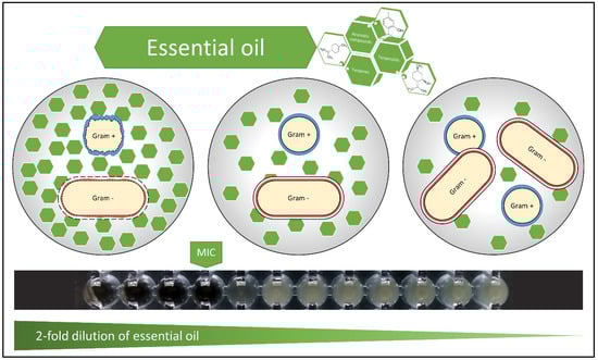 Effects of essential oil on bacteria. Gram-positive peptidoglycan cell wall allows hydrophobic molecules to penetrate and reach the internal environment. The lipopolysaccharide, which is part of the external layer of Gram-negative bacteria, allows mainly small hydrophilic molecules to pass and is only partly permissive for hydrophobic molecules. The hydrophobicity of essential oils is responsible for the disruption of bacterial structures. The mechanisms of action of essential oil on bacteria are: degradation of the cell wall and cytoplasmic membrane, cytoplasm coagulation and diffusion through the double lipid layer of the membrane, together with alteration of its permeability and function []. The black ribbon shows a twofold dilution set for aqueous extract of lavender oil and its effect against Pseudomonas aeruginosa (MIC = 6.3%; MBC was found to be >50%).