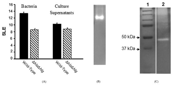 ) (P ≤ 0.001). When their culture supernatants were injected directly into the corneal stroma, the SLE score of the double mutant at 24 h after injection was substantial compared to normal eyes, but significantly lower than that of the wild-type strain (P = 0.004). (B) Non-denaturing (no SDS) zymogram of the pooled fractions of concentrated culture supernatant of the S. aureus double mutant (Newman ΔhlaΔhlg) containing toxic activities to the rabbit cornea. (C) A zymogram with SDS showing standard proteins (Lane 1) and the extracted toxin (Lane 2).