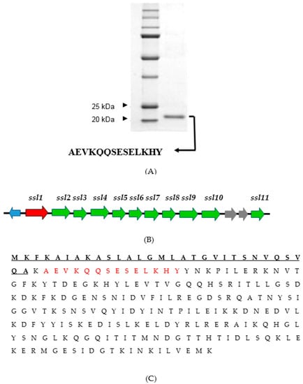 The concentrated supernatant of the double mutant was fractionated on a gel filtration column and then fractions were injected into rabbit corneas. Zymography of the fractions containing toxic activities under non-denaturing conditions demonstrated a single proteolytic band (Figure 1B). This protease extracted from the gel and, on a zymogram under denaturing conditions, was found to migrate at ~46 kDa (Figure 1C). This protease on a denatured and reduced SDS-PAGE migrated at ~23 kDa (Figure 2A), suggesting that dimerization was important for activity. The N-terminal sequence of 14 amino acids (i.e., A-E-V-K-Q-Q-S-E-S-E-L-K-H-Y) yielded in a BLAST search a 100% match with the SSL1 protein of strain Newman (from gene NWMN_0388; GenBank Accession Number BAF66660.1). Also, analysis of the SSL1 protein by mass spectrometry revealed only peptides matching the sequence of the Newman SSL1 protein (data not shown). The ssl1 gene resides within the SaPIn2 pathogenicity island [,] (Figure 2B) and encodes for a 25.6 kDa protein containing a signal peptide. Cleavage of the signal sequence, as determined by ExPASy Signal P program, theoretically results in a secreted protein with a molecular weight of 22.6 kDa (Figure 2C), which agrees with the SDS-PAGE size determination of the isolated protein (Figure 2A). The ssl1 gene, according to a BLAST search, is not present in other bacterial species, but is invariably found in all S. aureus strains examined, e.g., 88/88 sequenced genomes [].
