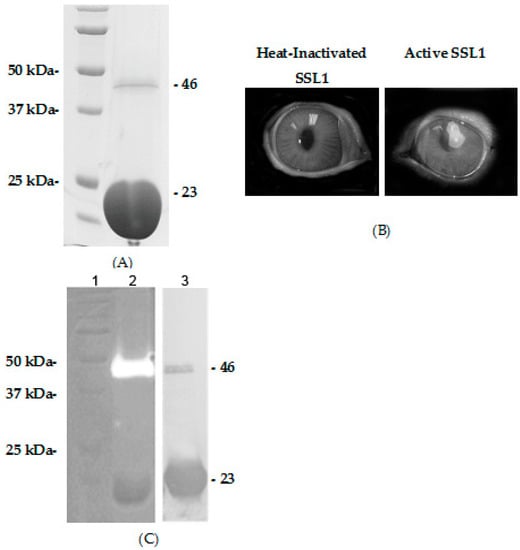 The ssl1 gene was cloned and expressed in E. coli as a recombinant protein with a 6-His tag on the C-terminus. Recombinant SSL1 was purified from the culture supernatant by metal affinity chromatography followed by gel filtration (Figure 3A). The purified recombinant monomer fraction (~23 kDa) was used as an immunogen to induce the production of polyclonal antibody in rabbits. Corneas injected with active recombinant SSL1 (12 µg), but not the heat-inactivated recombinant protein, produced substantial pathology (Figure 3B). These pathological effects caused by the active recombinant SSL1 were also produced in eyes of rabbits immunized with the SSL1 monomer (Data not shown).