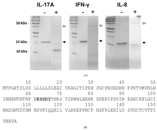 Degradation of host proteins by recombinant SSL1. (A) SDS-PAGE of human recombinant IL-17A (16 kDa), IFN-γ (17 kDa), or IL-8 (8.3 kDa) after incubation in phosphate buffer (-) or in the buffer plus active recombinant SSL1 (+; dimer: 100 ng) for two hours at 37 °C. Black arrows indicate the position of the un-cleaved substrate protein. White arrows indicate the position of the SSL1 dimer. (B) Amino acid sequence of human IL-17A. The 11-kDa breakdown product was sequenced by N-terminal analysis and the first five amino acids are RSSDY (shown in bold).