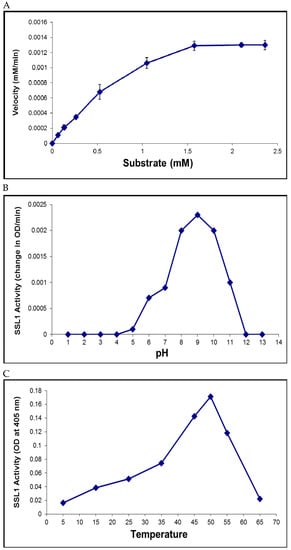 The effect of pH or temperature on SSL1 activity was also analyzed. The optimum pH for SSL1 activity was found to be pH 9, and the optimum temperature was 50 °C (Figure 5B,C).