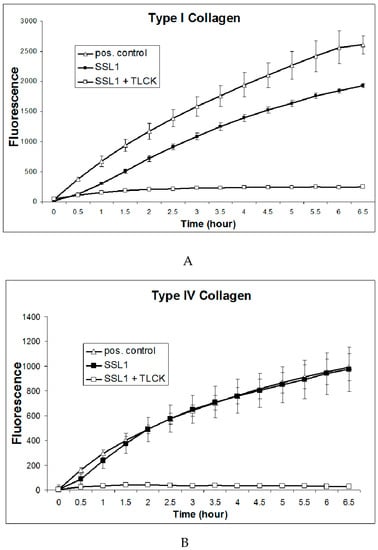 Furthermore, the recombinant SSL1 protease was found to cleave collagen type I and type IV (Figure 6A,B), which are structural components of the cornea [,].
