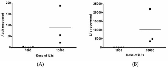 Recovery of S. stercoralis from gerbils infected with the human isolate of S. stercoralis (obtained from human faecal cultures). The number of adult parasitic worms (A) and L1s (B) were represented.
