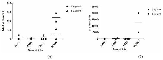 Recovery of S. stercoralis from gerbils infected with the human isolate of S. stercoralis (obtained from gerbil faecal cultures) (1 mg of MPA versus 2 mg of MPA). The number of adult parasitic worms (A) and L1s (B) were represented.