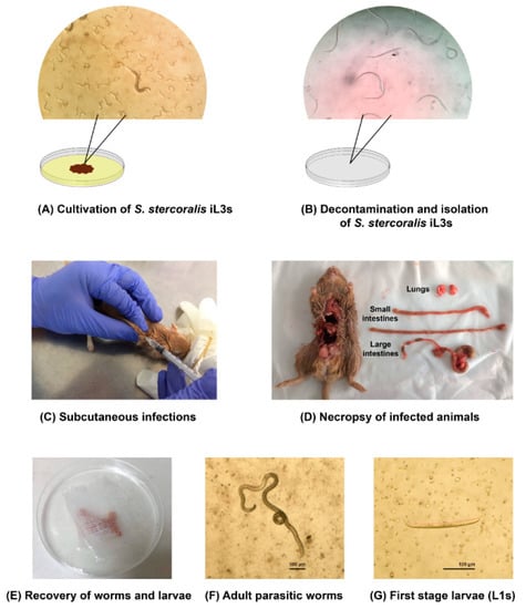 The human isolate of S. stercoralis was harvested from faecal specimens of strongyloidiasis patients from the King Chulalongkorn Memorial Hospital, Bangkok, Thailand. Agar plate cultures were set up to obtain iL3s for the experimental infections []. Approximately, 1–3 grams of stool specimens were placed on the centre of agar plates and incubated at 25 °C for 5 days (Figure 3A). The iL3s were collected from the surface of positive agar plates by washing with the buffer saline solution (BU saline) (22 mM KH2PO4, 50 mM Na2HPO4, 70 mM NaCl). The iL3s were decontaminated by using low melting point agarose and then axenized in BU saline with 100 U/mL penicillin, 10 µg/mL streptomycin and 12.5 µg/mL tetracycline for 3 h (Figure 3B).