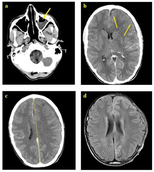 (a) Left ethmoid sinusitis; (b) Meningitis; (c) Meningitis and midline shift front to parietal collection; (d) Brain MRI post decompression (craniotomy).
