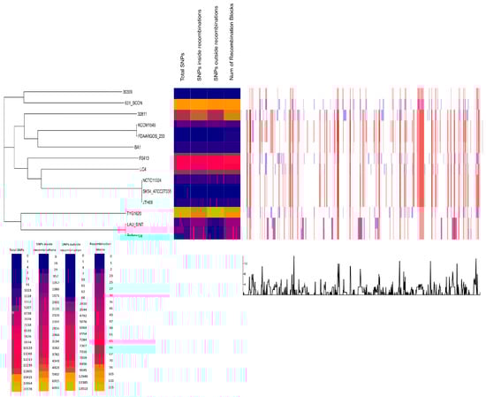 Clear-cut regions were observed in favor of recombination, with a few isolates sharing of genetic shuffling. TYG1620 was overly distinct in its high total number of SNPs, both inside and outside the boundaries of recombination blocks. F0413 and LC4 also clustered close to each other, having similar preference in recombining loci.