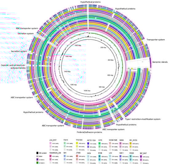 Full chromosome comparison revealed similarity rates between the SI genomes ranging from 52% to 100%, with JTH08 and NCTC 11324 being 100% similar. A comparative analysis between LAU_SINT and B196 on RAST revealed that only 78 genes were unique to LAU_SINT while 101 genes were unique to B196. The uniquely identified genes in LAU_SINT included hypothetical proteins, phage proteins, and a metallo-β-lactamase family protein (matching a metallo-hydrolase in Staphylococcus xylosus PNZ15953). The unique genes in B196, however, included hypothetical and CRISPR-associated proteins. Circular genome comparison of the 17 isolates, used to examine major deletion events, revealed the presence of a large phage in LAU_SINT and 567_SINT matching that of Clostridium phiCT453B (accession # NC_029004). Variability between the genomes was mainly due to differences in secretion and transporter systems and GIs (Figure 5).