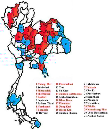 Map of Thailand showing locations of the sample-collection sites in the 31 provinces of 6 regions in affected areas. Red denotes the collection locations of positive Zika virus (ZIKV) in mosquitoes and blue denotes negative ZIKV in mosquitoes.